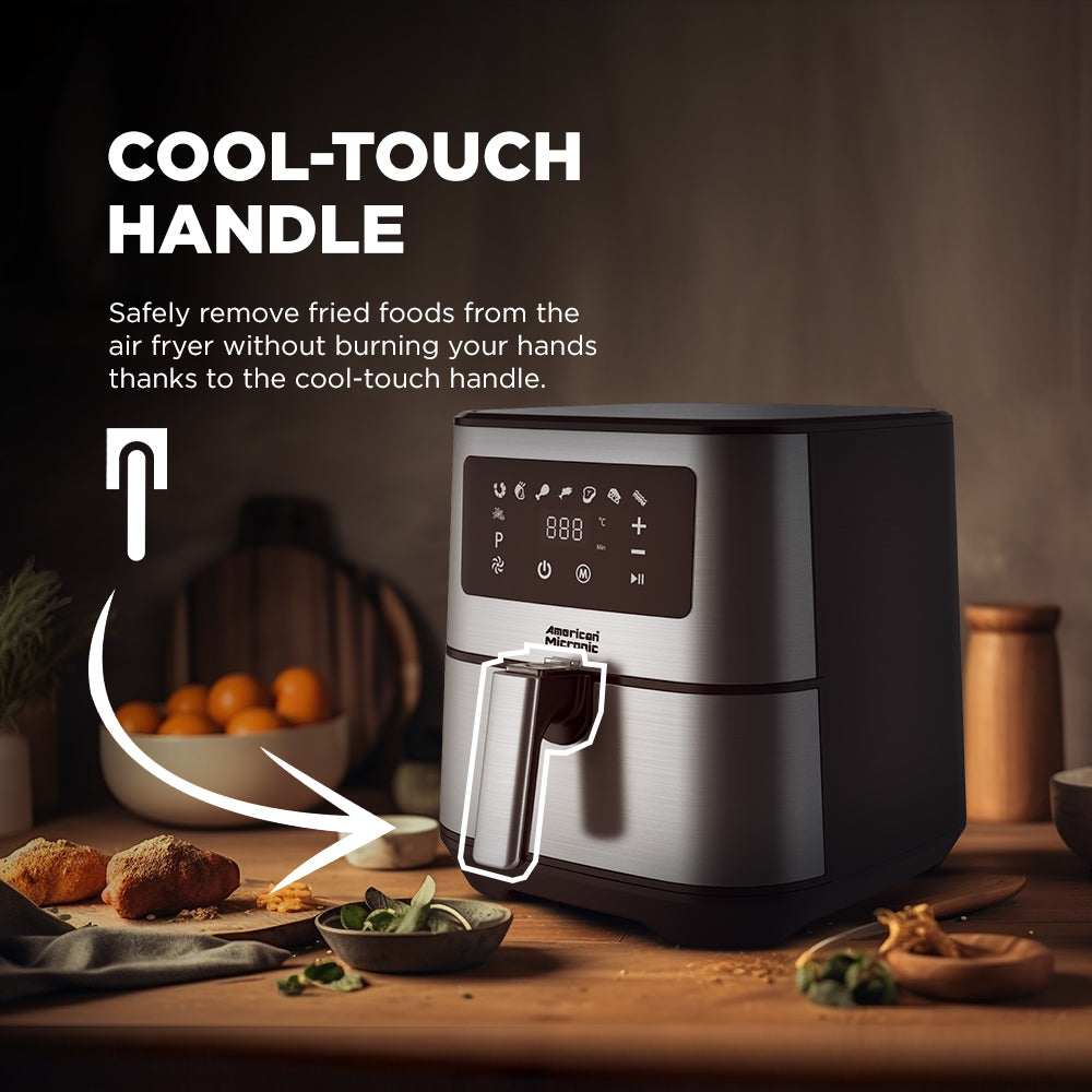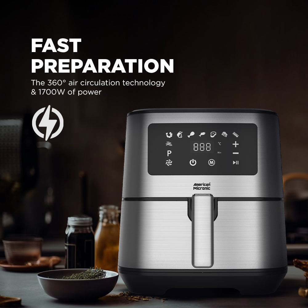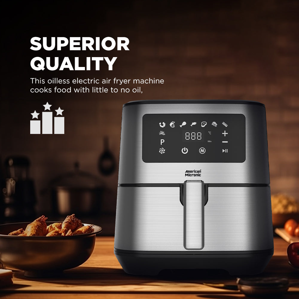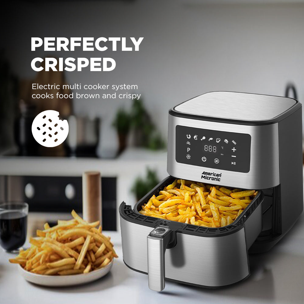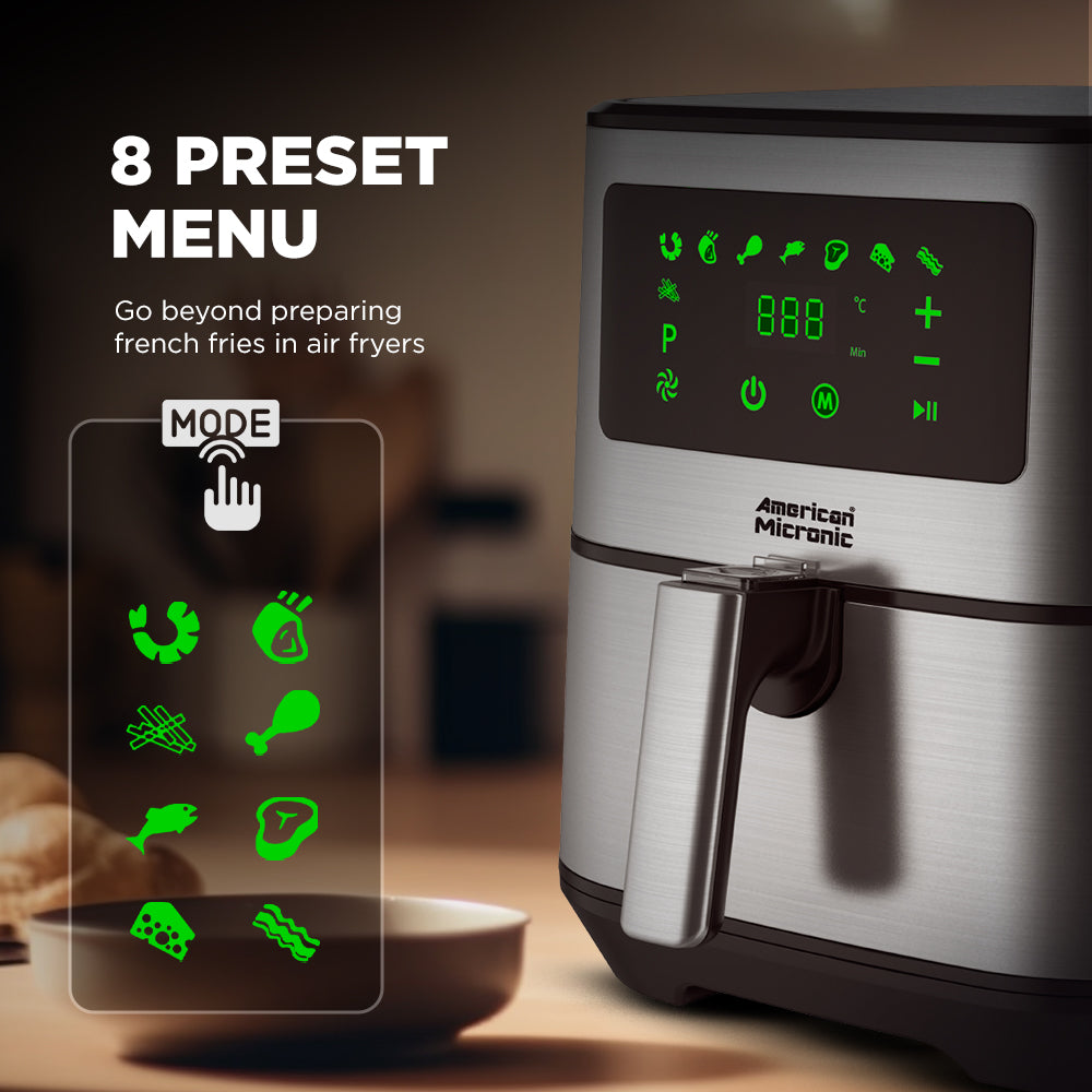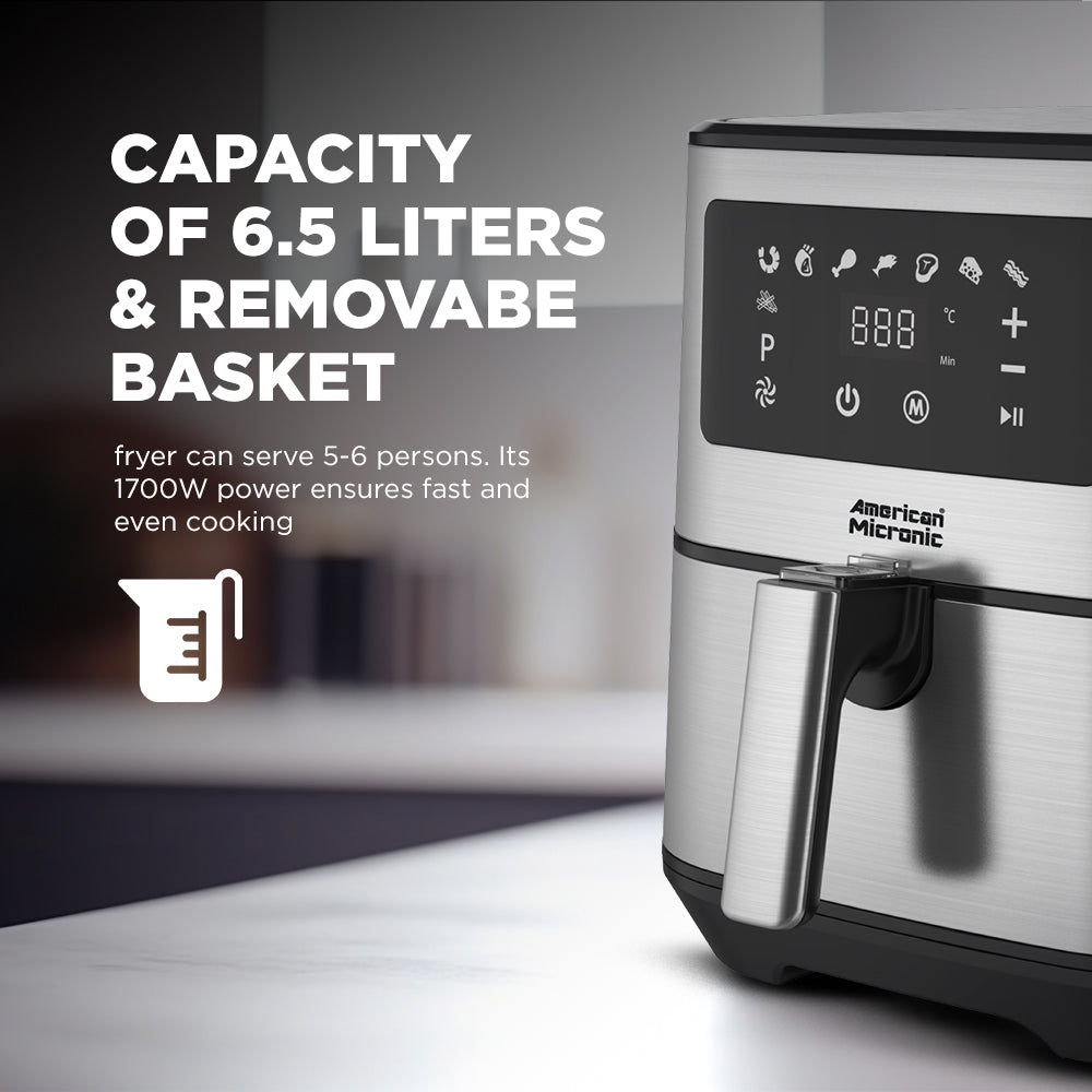 Introducing the American Micronic Digital Air Fryer, a kitchen essential for healthier and more delicious meals. With its 6.5-litre capacity and Turbo Tunnel Fresh Air fryer Technology, this oil-less electric air fryer ensures 360-degree air circulation, creating perfectly crisp results with minimal oil. It offers 8 preset menus, making it easy to prepare a variety of dishes with a single touch. The 1700W power, 200°C temperature control, and 60-minute timer guarantee fast and even cooking. Its energy efficiency and easy-to-use interface with LCD make it suitable for everyone. Elevate your kitchen experience with this sleek and stylish appliance.